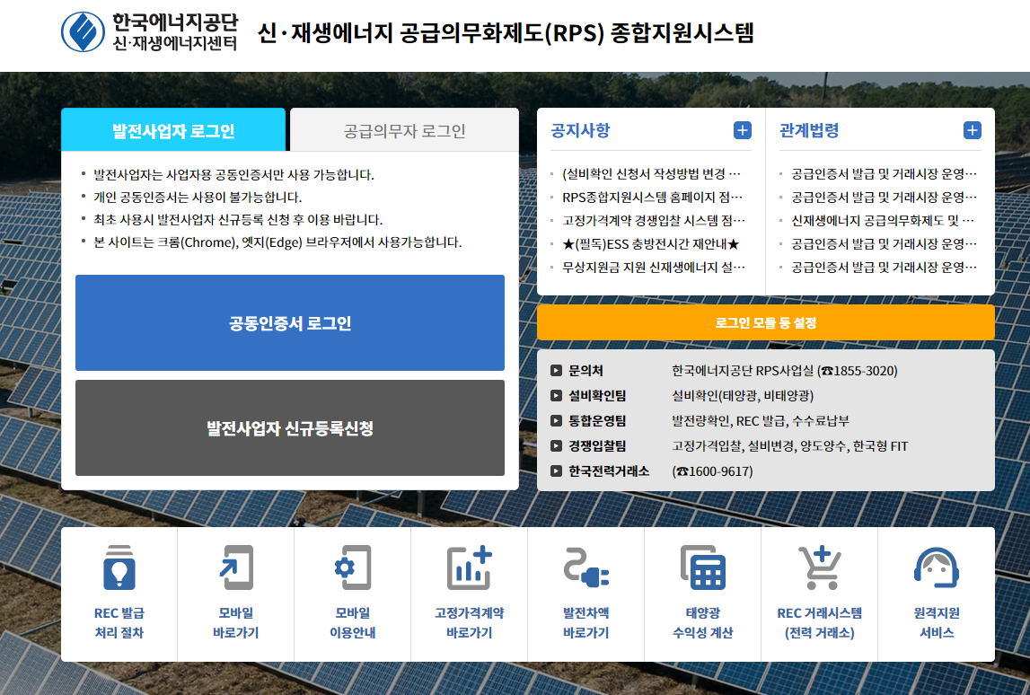 온라인 웹사이트를 통하여 접속을 하시면 관련된 법률 및 제도, 발전기술 정보, 싱장 동향 등 다양한 정보 획득도 가능하구요. 발전사업자 및 공급의무자는 로그인하여 REC 거래 등을 지원하는 다양한 서비스를 이용 가능하다고 합니다.