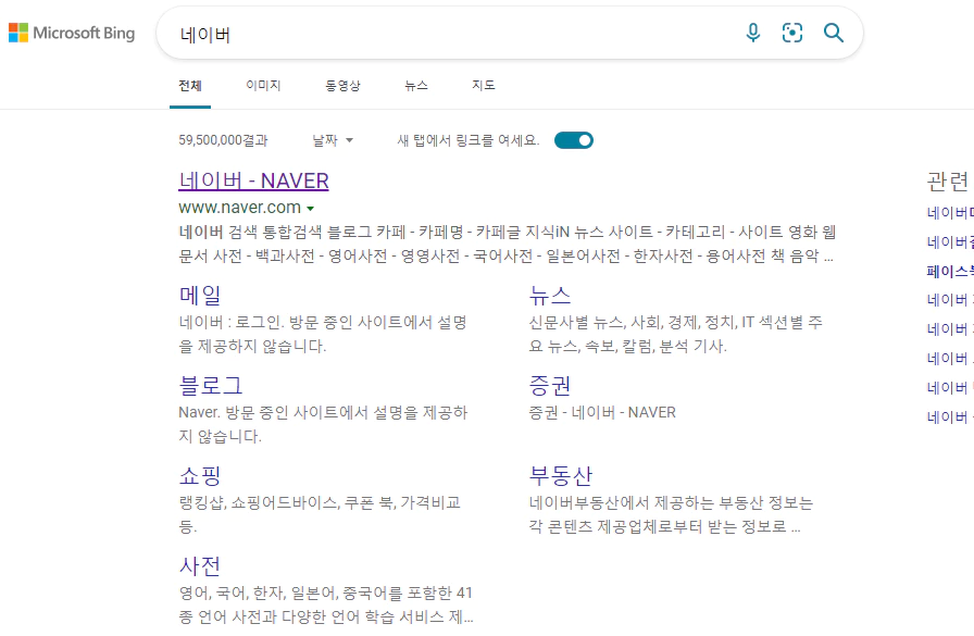 이는 대부분의 브라우저들이 기본 검색엔진으로 Bing이나 Google을 사용하기 때문인데요. 거기에 DAUM조차도 '네이버'를 검색하면 웹사이트로 연결되는 링크를 확인하실 수 있습니다. 여기에 메인 이외에도 지도, 블로그, 쇼핑, 증권, 뉴스 등의 서비스도 쉽게 찾아서 들어가실 수 있습니다.
