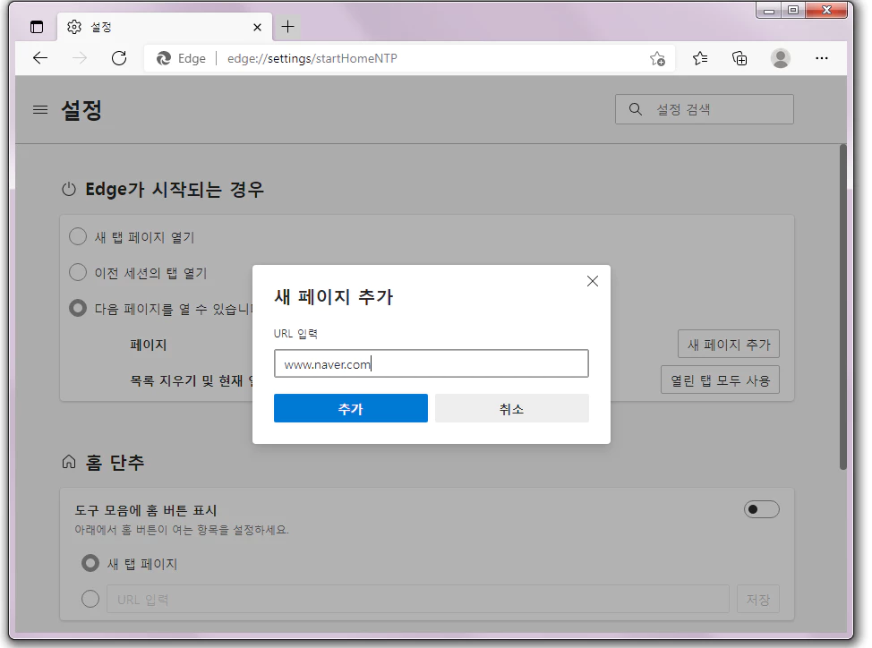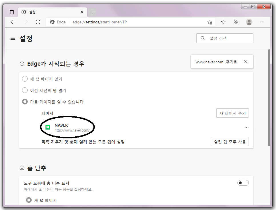 시작페이지를 변경하는 방법은 브라우저 설정에서 시작 페이지에 네이버의 주소를 추가하면 됩니다. 대부분의 브라우저들은 비슷한 방식으로 설정이 가능합니다. 이는 아무래도 최근에는 크롬기반의 브라우저가 많아져서 통일이 된 것 같네요.