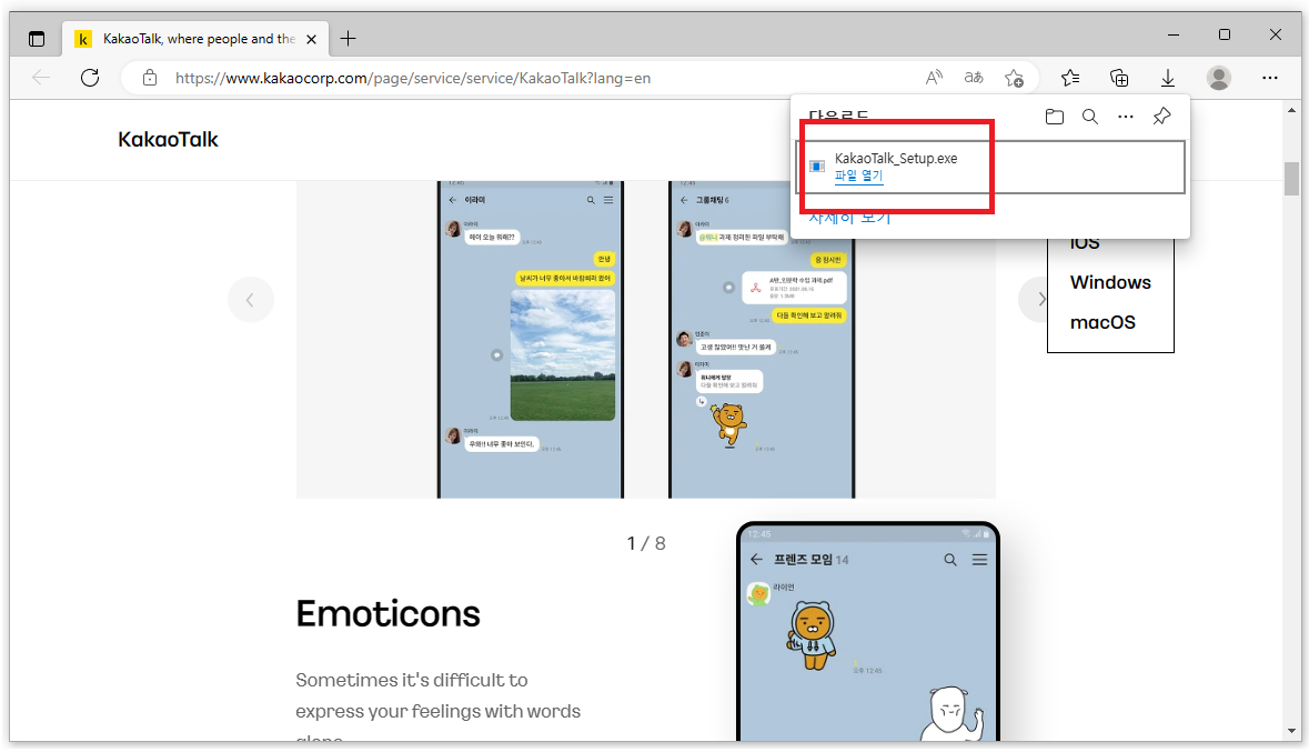 저는 윈도우운영체제를 사용하기 때문에 해당 버전을 컴퓨터에서 받아서 설치를 진행하였습니다. 아래 카카오톡 설치과정도 같이 확인하시죠.