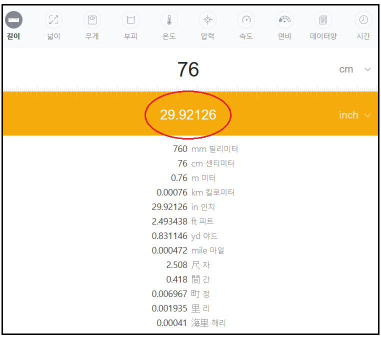 그럼 다시 76cm라고 하면 몇 inch로 나오게 되는지 확인해보았습니다. 그 결과는 29.9로 확인이 되었습니다. 대략적으로 30인치라고 봐도 무방할 것 같습니다.
