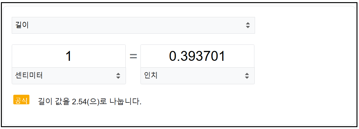 1센티미터는 0.393701인치로써 이렇게 보면 상당히 복잡해보입니다. 그래서 반대로 확인을 해보았는데요. 그러니 결과는 1inch가 2.54cm로 계산이 되었습니다.